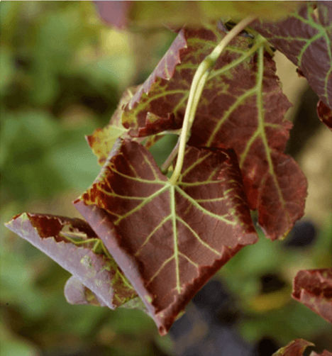 Red grape varieties (Merlot, Cabernet Sauvignon, etc.): reddening of the leaves while the veins remain green.